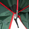 У палатки большой вход, что позволяет при необходимости вносить в него различное оборудование длякухни. Полог входа имеет два замка сверху и снизу молнии, в случае необходимости можно делать второе отверстие для вентиляции палатки, используя верхний замок молнии. Напротив входа в стенке палатки есть полукруглое вентиляционное окно. Это окно существует не только для вентиляции: если вы оборудуете летний душ, то емкость с водой можно разместить на ближайшем дереве или столбе, врытом в землю, так как обычно эта емкость достаточно много весит, а шланг с лейкой пропустить через указанное окно. И окно, и полог входа имеют специальный клапан, закрывающий молнию от проникновения воды в палатку. Кроме того, в верхней части купола палатки вшита сетка для дополнительной вентиляции. Сетка закрыта специальным колпаком, защищающим от дождя.